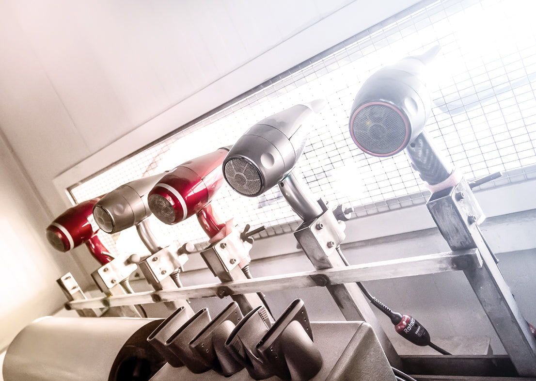 Wir haben ein Testlabor eingerichtet, in dem die Geräte rund um die Uhr laufen, um alle Komponenten auf Herz und Nieren zu prüfen und unsere Versprechen in Bezug auf Haltbarkeit und Widerstandsfähigkeit einzuhalten. Wir haben Maschinen entwickelt, die die Bewegungen des Friseurs simulieren, um im Labor die Beanspruchung des Haartrockners im Salon nachzustellen. Das Vertrauen der Fachleute steht für uns an erster Stelle.